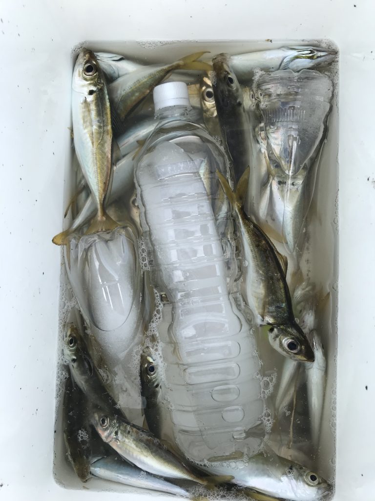 折角釣れた魚ですが美味しく持ち帰りたいですよね。クーラーボックスに海水と氷を入れた状態にしてアジなどの30センチ以下の魚であれば生きたままそこに入れていけばOKです。